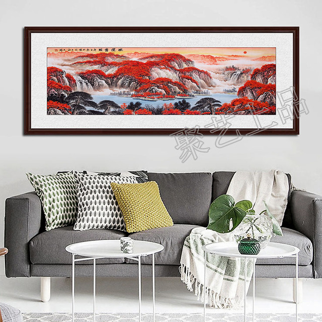 大山绵延远大,预示着画的主人前程远大、潜力无限。众山头也被太阳的光彩所点缀,流水生财,旭日东升,鸿运当头,种种的好寓意都告诉你,它是你家客厅墙面装饰的上乘之选。