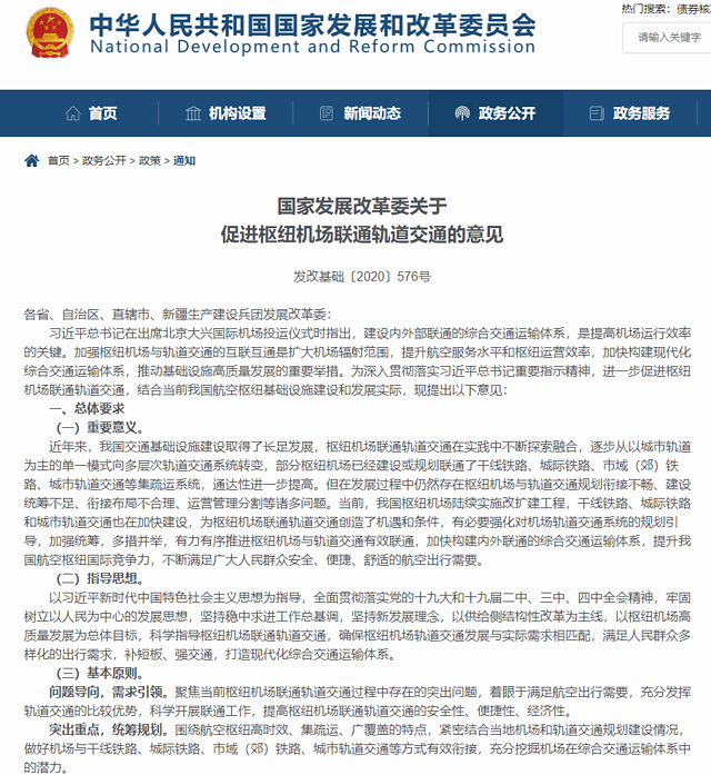 意见提出,国际枢纽机场应联通干线铁路或城际铁路或市域(郊)铁路或城市轨道交通,有效辐射周边800~1000公里范围内的地区。区域枢纽机场应尽可能联通干线铁路或城际铁路或市域(郊)铁路或城市轨道交通,有效辐射周边300~500公里范围内的地区。