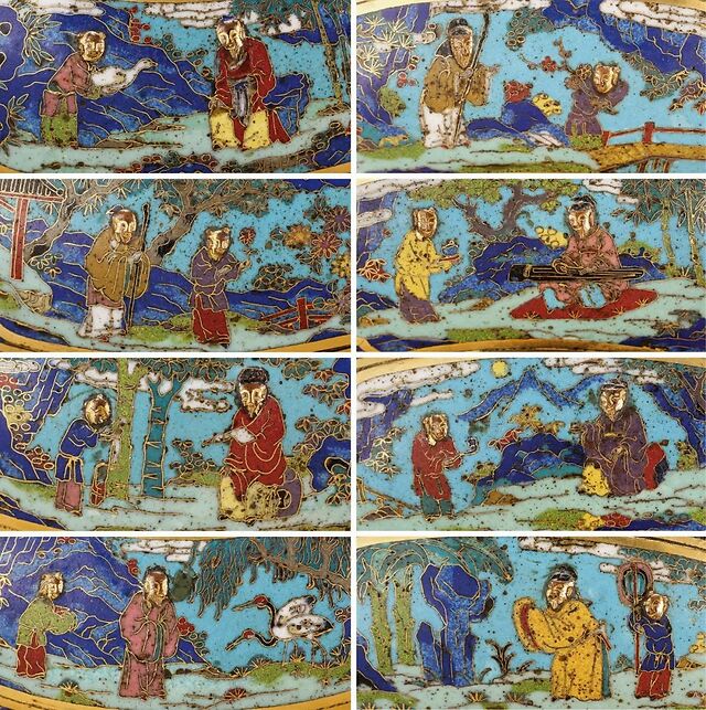 盒盖和器身的周壁纹饰基本相同,各有四组开光,开光之间为方胜、犀角、宝珠、珊瑚等杂宝纹。开光之内雕有山水人物,楼台屋宇,流云杂树等纹样,分别是:“倪瓒洗桐”、 “陶渊明爱菊”、“王羲之爱鹅”、“饲鹤图”,及“米芾拜石”、“林逋爱悔”、“抚琴图”、 “李白对酒邀月图”等高人逸士的故事。众场景色泽丰富烂漫,人物面目喜庆欢愉,各有趣味。著名的古代文人典故之一。众多怪诞有趣的关于文人士大夫的故事,多发生在宋元时期,是因为宋朝科举制度的完善,市井气息的形成,使得士大夫文化成为宋朝文化之主流,这样就形成了诸多的以士大夫的雅文趣事,流传于世,读来使人顿生闲情雅趣之感。