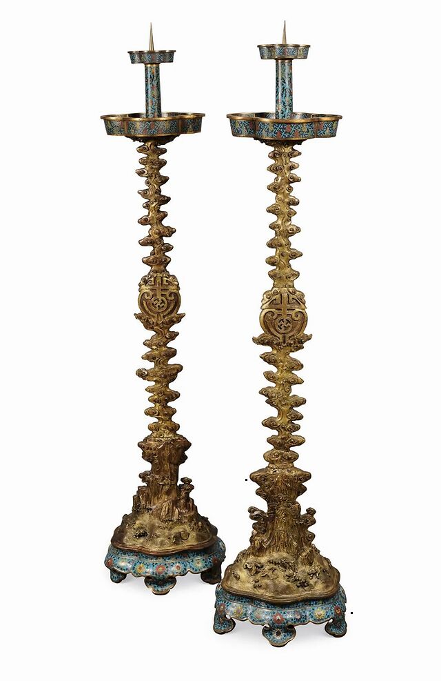 清康熙 铜胎掐丝珐琅万寿无疆烛台 (一对)