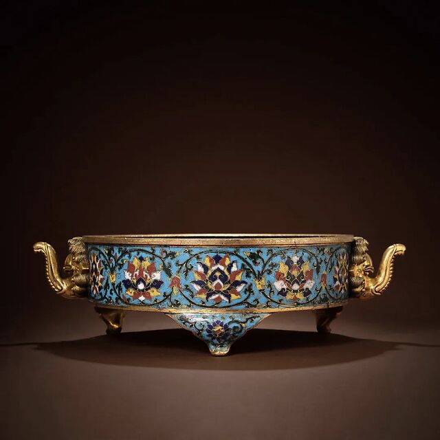 明宣德 御制铜胎掐丝珐琅缠枝莲纹双象耳三足炉