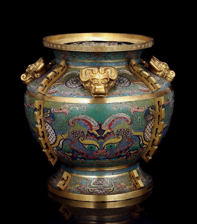 清雍正 铜胎掐丝珐琅饕餮玉璧纹出戟羊首罍