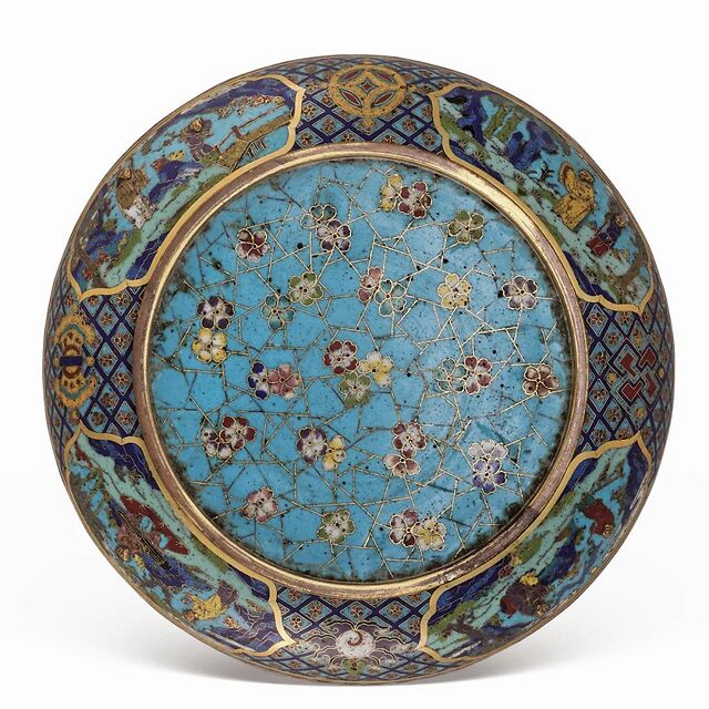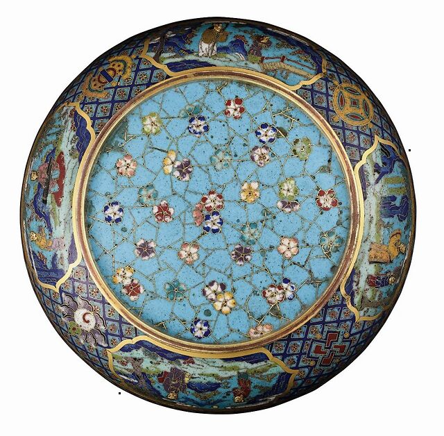 盘内壁以墨绿釉色为地,上绘白色栀子花,花叶相伴,环于盘周,齐整排列。盘器外壁亦以天蓝色釉作地,上绘成串葡萄零星点缀于沿口上部,疏朗有致。此件掐丝珐琅彩绘花果纹盘形制规整,构图精美,掐丝细致,天蓝色珐琅釉具有典型的早期特点,釉料厚实而纯正,明亮亮丽,半透明的珐琅釉犹如水晶般晶莹,为珍贵的元代掐丝珐琅器。