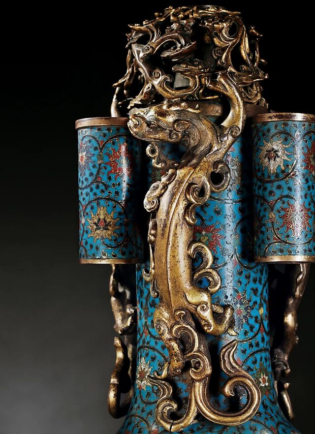 此器器形较为少见,其主体仿效陶瓷器中贯耳瓶的造型,据查史料,贯耳瓶造型流行於宋代陶瓷品中,因其器形典雅优美,至明清形製渐变但仍颇为流行,并被效仿沿用到其他工艺品製作中。此件器物的主体部分即是采用了贯耳瓶的造型,长颈近口沿处附三枚贯耳,其下垂肩、鼓腹,下接高圈足。器口部装饰有镂空鎏金云气纹饰件,另有三只蟠螭附於瓶颈,从肩部蜿蜒而上,似要遁入云气之中,引首互望,极富动感,蟠螭神态威猛张扬,身体盘绕之状甚明显,象征最高权力,实属罕见。瓶肩部镶三枚鎏金羊首,口中衔环,造型简练大方。器腹部三组鎏金镂空出戟,系仿商周青铜器之装饰。底部圈足外附三组铜鎏金异兽及团螭作为底足承托住整器,兽足造型古朴稳重气势夺人,在功能上更增加了器物的稳固度。