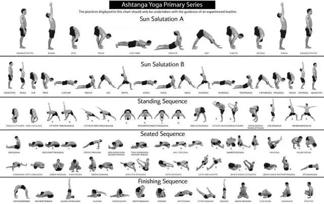 每种级别的动作编排是固定不变的,都以5遍太阳祈祷式A和B开始,中间有大量的体位姿势练习,最后以倒立和休息术作为结束。