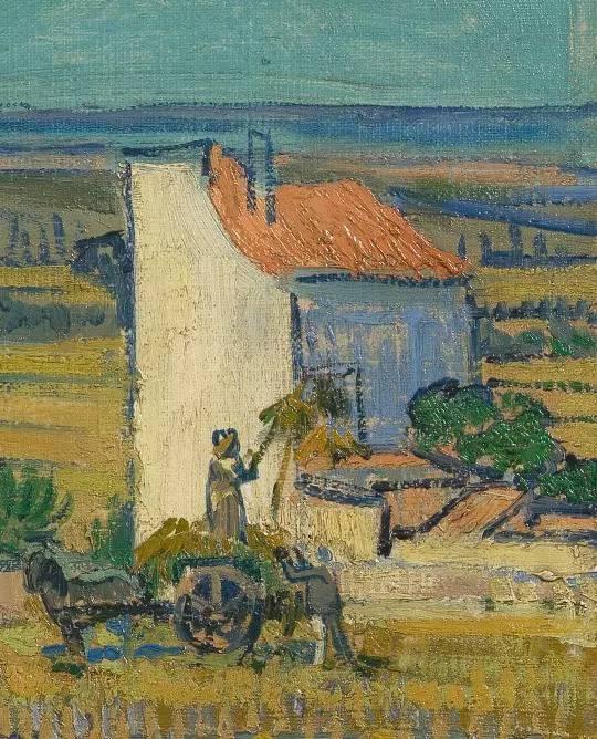 太阳像个大的咸蛋黄,天空有点发绿,山丘却是蓝色的,从低到高,拉成一条斜线,稀疏的坐落着几个简陋的房子,大面积金黄的麦田,麦浪随风翻滚着,是个丰收的秋天吧?可只有一个人挥舞着镰刀在收割,是想告诉我们什么呢?你眼里的世界如此美好,可是却只有你一人在欣赏?