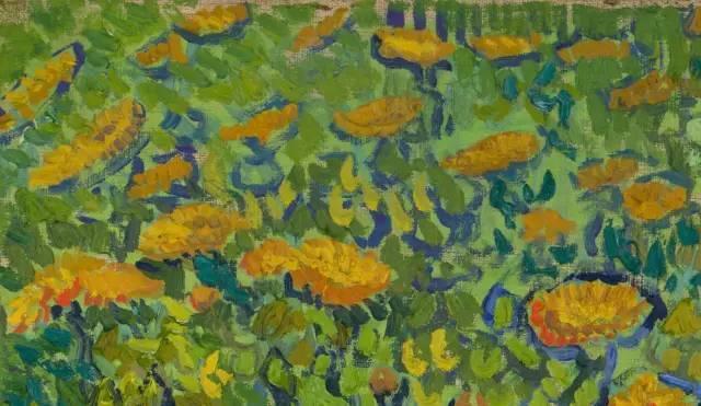 《鸢尾花》中最为引人注目的,应该是位于画面左侧,那一大朵白色的鸢尾花。不是被众星拱月地包围在其中,而是选择了像个局外人一样,孤单地悄然独开。它离盛开的画面中重要表现的那片蓝紫色鸢尾花,和后面作映衬的万寿菊都有一段距离——孤寂又带有那么一点刻意的避世,这是明显的高更式构图风格,格外醒目。