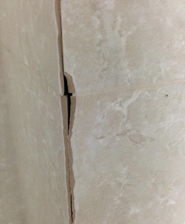 到了现场以后,我看了一下瓷砖的情况,然后又看了一下其他房间的墙面。我给业主说这种情况,是因为现在墙体产生了沉降,使瓷砖已经产生了扭力,现在已经能看得出把一部分瓷砖的瓷片都给挤掉了,而且还有一两片瓷砖已经产有了裂痕。