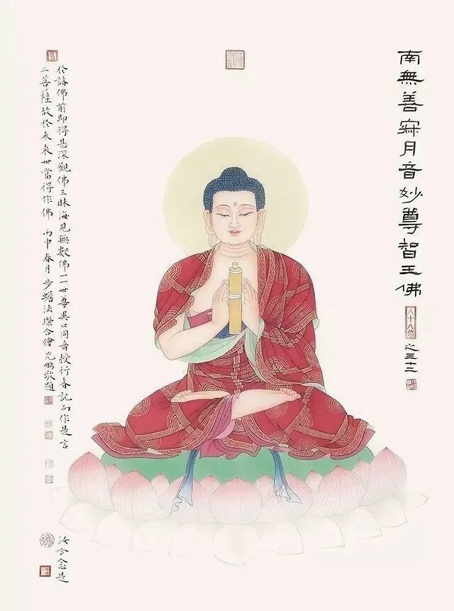 善寂月音妙尊智王者,谓智照如月,觉妙若音,经云:“菩萨清凉月,常游毕竟空”。善寂月音也。又云:”众生心水净,菩提影现中“。妙尊智王也。上句为喻,下句为法,谓以权实智光,觉法自在,如月形影,音响一切,双亡双照,故名善寂月音妙尊智王也。