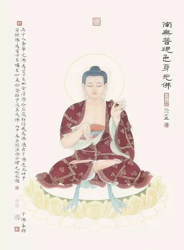 普现色身光者,《华严经》云:“佛身充满于法界,普现一切群生前”。圆光普照于十方,示现种种所行事,故名普现色身光也。
