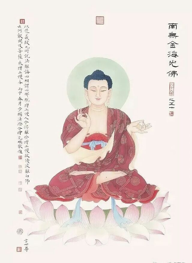金海光者,谓佛身如海,金光紫赤,照耀无穷,以喻海印三昧,表法殊胜,故《楞严经》云:“如我按指,海印发光”。故名金海光也。