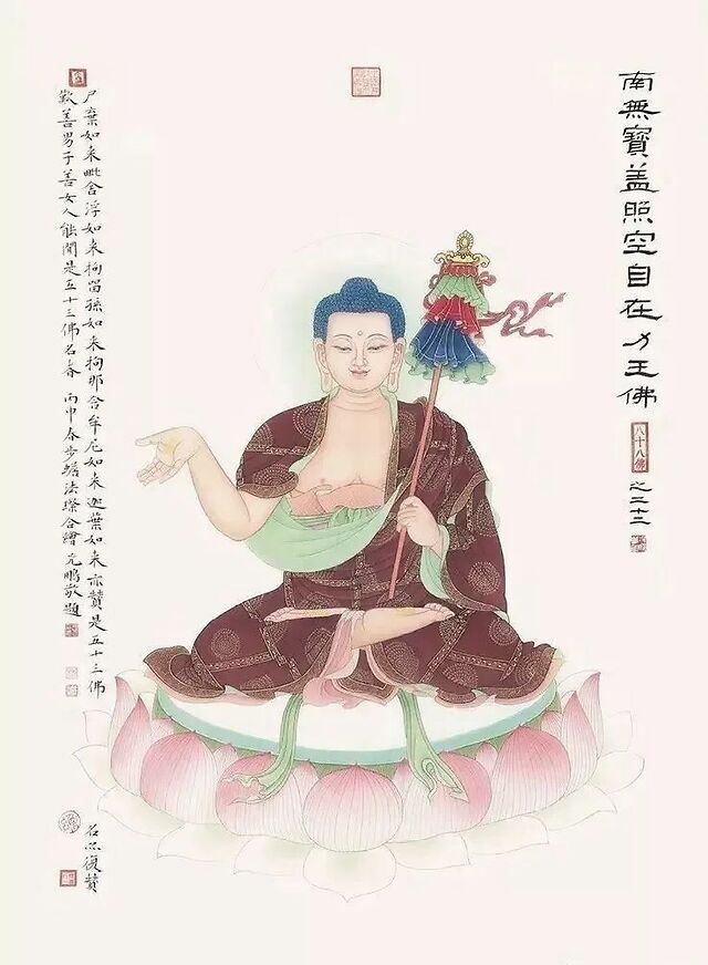 宝盖照空自在力王者,以信为宝,七菩提分为盖,照耀虚空,令诸众生得大利乐,自在无碍,故名宝盖照空自在力王也。