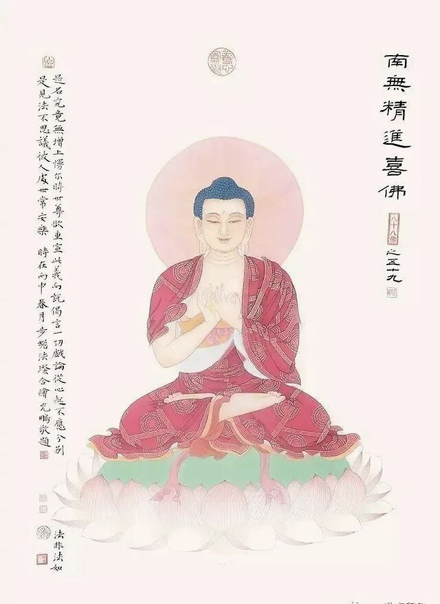 精进喜佛,谓精进乃修道之宝,由精进故,专心向道,得法喜乐,佛果圆成,故名精进喜也。