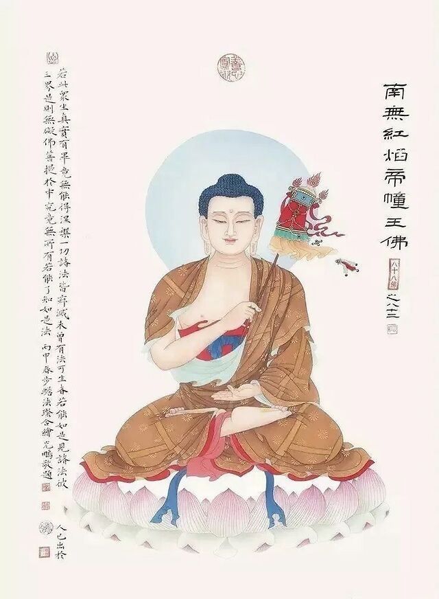 红焰帝幢王者,红焰乃天帝宫中赤珠幢之光也,珠光远射,故日红焰,此幢惟天帝宫中所有,故称为王,以喻如来身相,紫金光焰,大千国土,惟佛最尊,故名红焰帝幢王也。