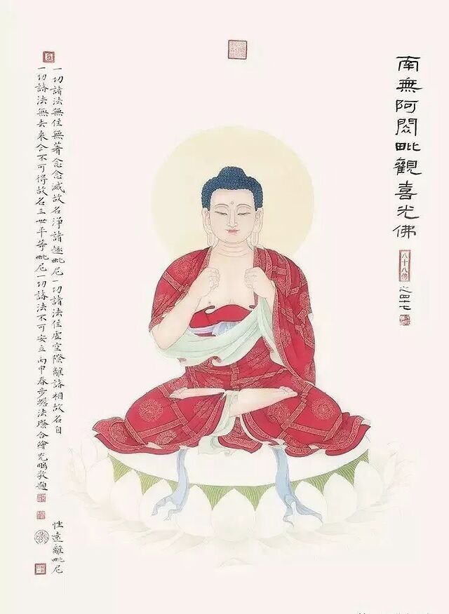 阿閦毗欢喜光者,阿閦毗,此云不动,佛名如如不动故;欢喜,国号,人天喜爱故;光者,谓依正二报,并放光明。不动寂常,十方遍照,一切人天无不欢喜,故名阿閦毗欢喜光也。