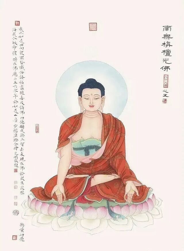旃檀光者,《楞严》云“自得心开,如染香人,身有香气”,今本佛香光庄严,明净满足,众生见者,心眼开明,故名旃檀光也。