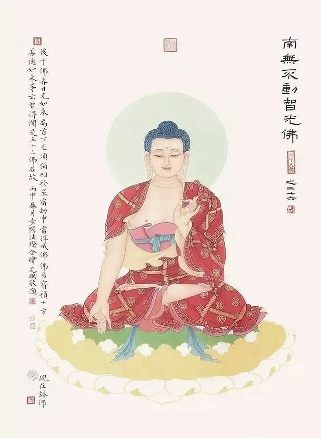 不动智光者,不动智,即根本智,体也,谓本佛法身,如如不动故;光者,即差别智,用也。谓从体起用,如月印千江,故名不动智光也。