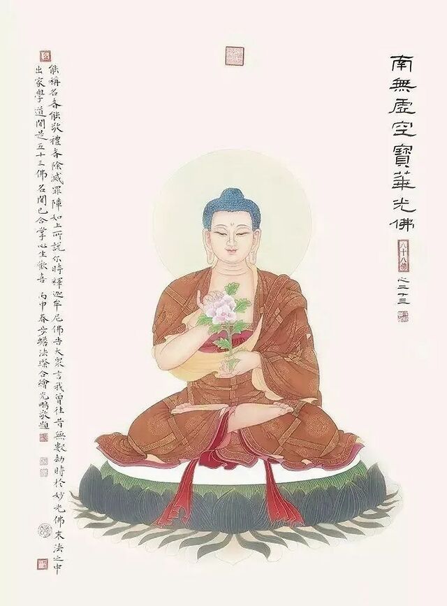 虚空宝华光者,法身无相,犹若虚空,本来无染,故称为宝,心花发焰,照真法界,故名虚空宝华光也 。
