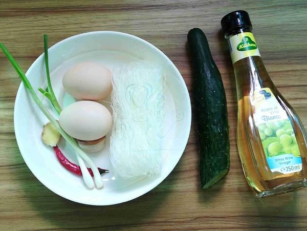 黄瓜 半根、鸡蛋 2个、粉丝 1小把、辣椒 1只、葱 1根、姜 1片、蒜 1瓣、酱油 1汤匙、醋 1小勺、白糖 少许、精盐 适量、芝麻油 适量