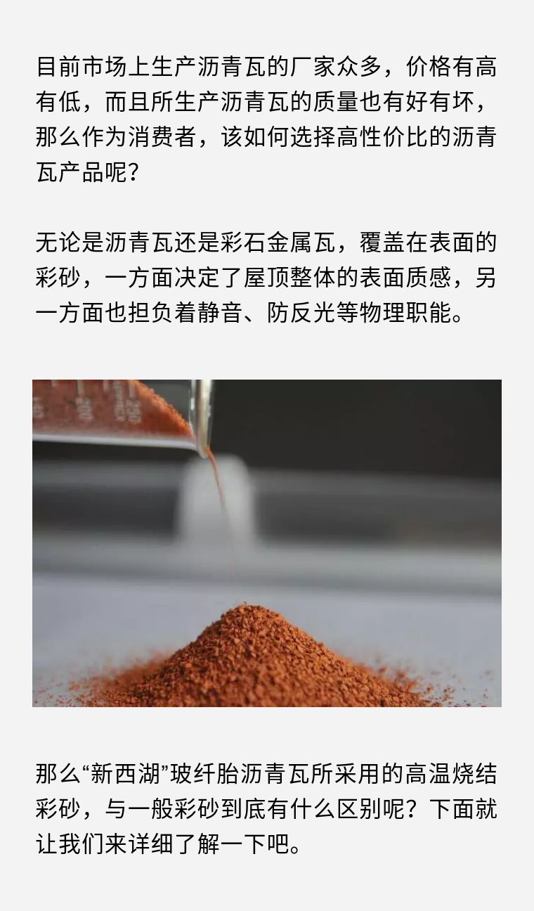 沥青瓦目前一般都采用:染色彩砂、低温烧结彩砂、高温彩砂。