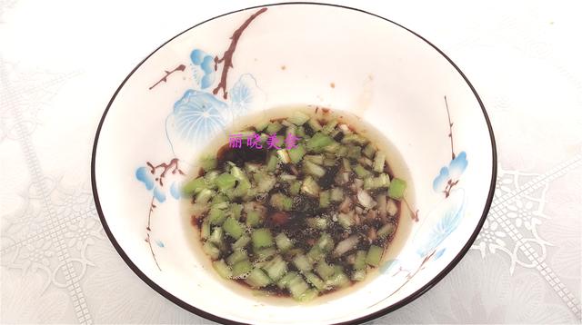 6、蒜蓉青椒丁都放到小碗中,浇入两勺热油爆香。再添加盐 鸡精 生抽 蚝油 陈醋调味,香喷喷的料汁就做好了
