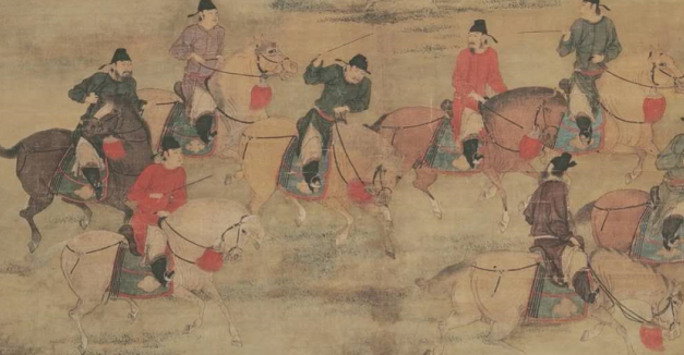 后梁 赵喦 八大游春图 (台北故宫博物院藏)可见唐-五代驱马马鞭、策的样式,就是直杆竹或铁制,并无皮质部分,于王彦章的铁鞭样式大致相仿。