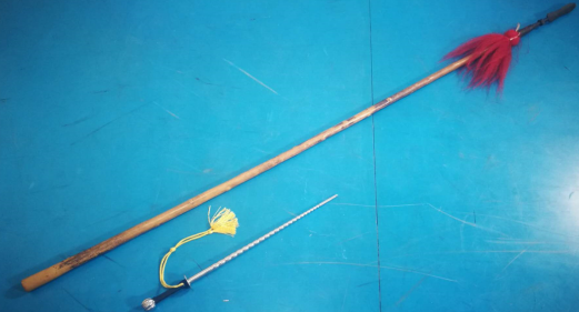 接下来就是鞭枪配合演练了。鞭和2米长枪对比:这是一条步下花枪,马上用枪无疑比这个长得多。