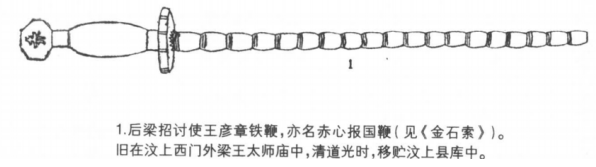 在马上应用颇广的铁马鞭最终被用于兵器,鞭在宋代载入了官修的兵书《武经总要》,并有说明:“铁鞭铁锏两色,鞭其形状大小长短随人力所胜用之,人有做四棱者谓之铁简,言方棱似间形者皆鞭类也。”