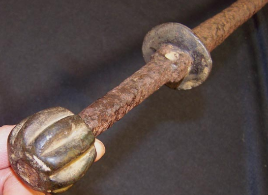 此鞭全长65厘米,重不到2斤。护手和配重锤为铜制,其余为铁制,护手前段7厘米处无节,其余鞭身尽布竹节,上手观看后笔者认为这是一支明代鞭,尤为独特的是鞭的手绳穿孔位置不在手柄尾端而在柄箍处。柄箍加粗后穿孔挂绳以悬腕。