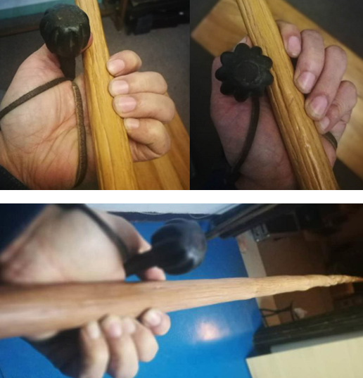 鞭置于于前手,绳挂于腕上,手绳长短依个人习惯调节。我们知道在持扎枪时的基本动作是拦拿扎,其中后手动作幅度大,发力大。前手起杠杆作用中的支点,相对稳定,鞭置于前手也可以缩短与敌人的距离。此鞭重心在档前9厘米处,挂上后手绳通过掌心,挂在虎口(以下为万兄以原品演示)