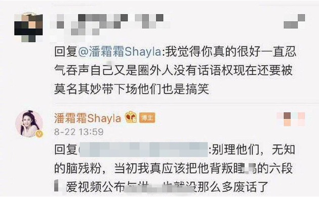 甚至还有网友扒出了2019年8月,潘霜霜回怼林峯粉丝的言论,称对方的粉丝都是无知脑残粉,更表示自己手握林峯劈腿的六段视频,信息量巨大。最后潘霜霜还喊话林峯:「做了什么缺德事,才演变后续的局面,自己心里没点数吗」。