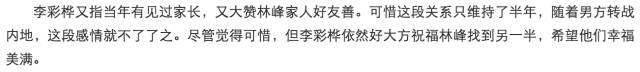 根据李彩桦本人透露,林峯与她是有过一段暧昧的,双方曾在一个剧组拍戏,期间林峯不断向她投喂零食,还会细心地等她收工,送她回家。更透露当时双方已见家长,关系很好。但两人聚少离多,恋情只维持了半年就不了了之,如今时过境迁已很少联络。不过,这段恋情林峯并没有承认。