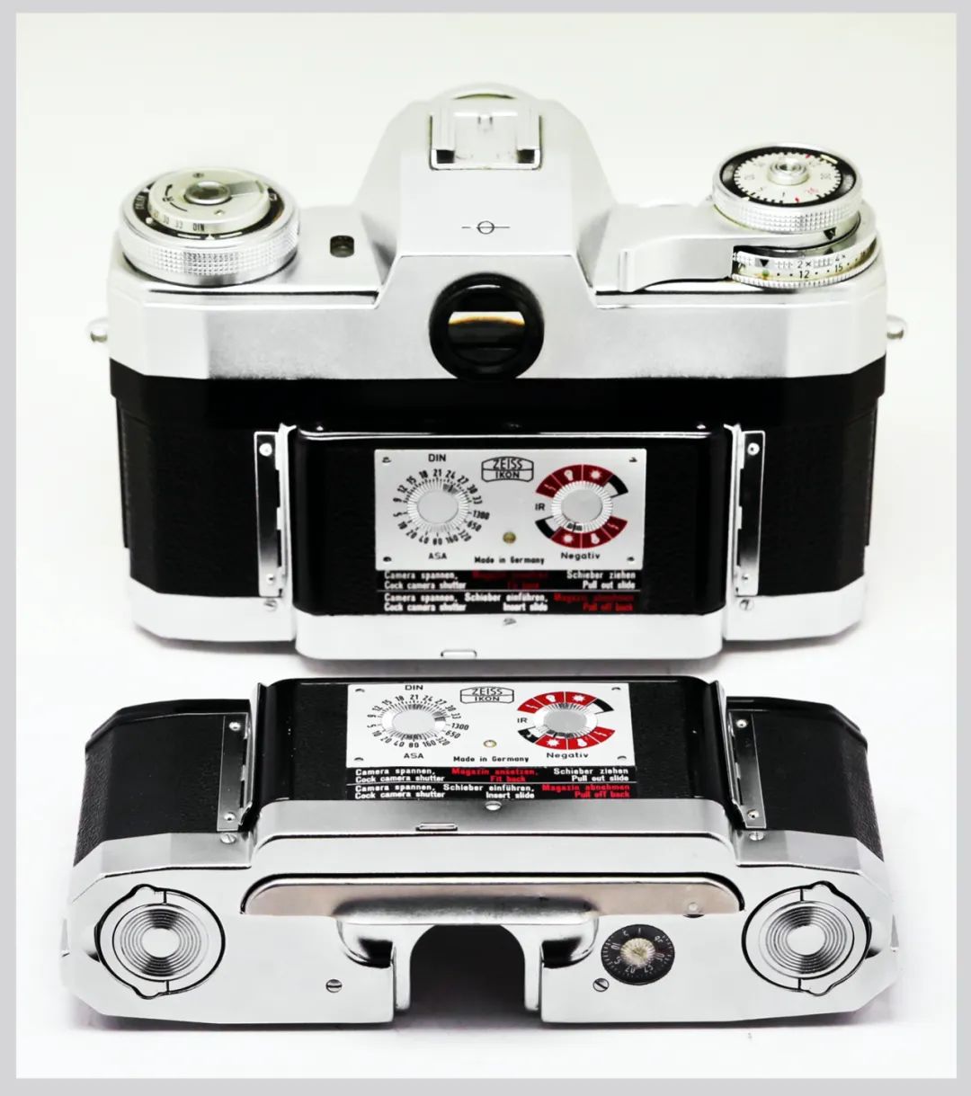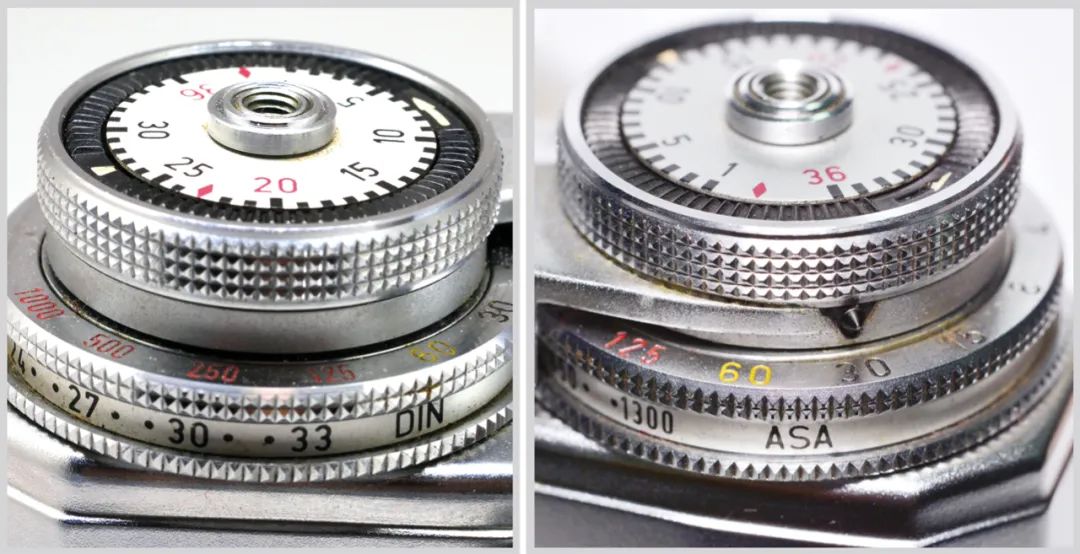 04.“独眼龙”相机的感光度调节盘标识有德制和美制两种,左侧采用德国 DIN制,右侧采用了美国 ASA 制