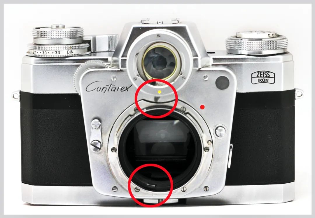 11.测光表头下方和镜头卡口内的光圈拨叉(上、下红圈内)
