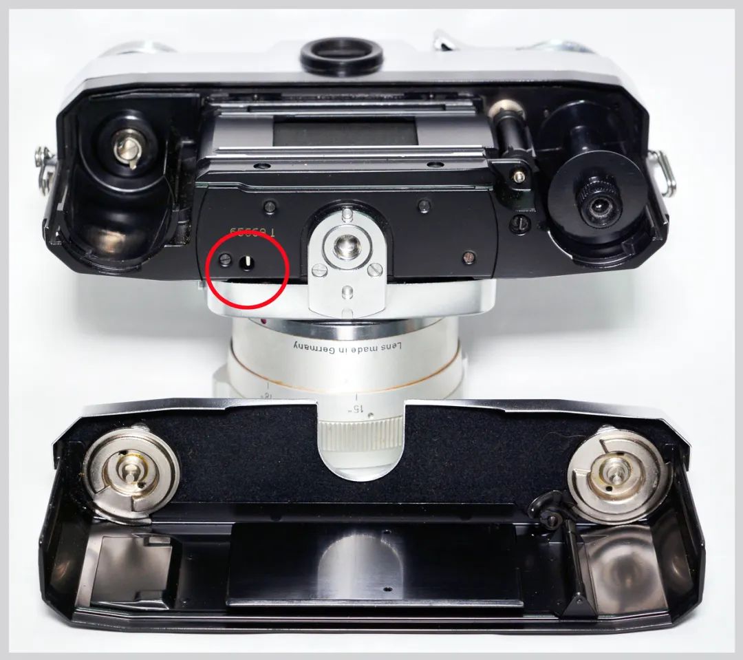 该机测光表头的下方有一个光圈拨叉(图11上面红色圆圈内),安装不同口径镜头时,镜头根部的缺口会顶推拨叉使光圈拨轮同步变化,此时表头上部光圈显示窗口内的三角标会同步显示该头的最大光圈。
