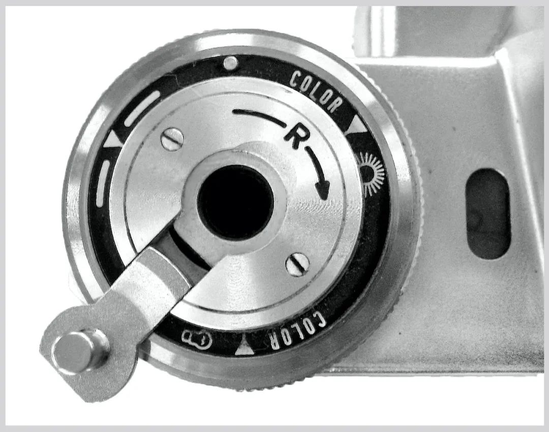 “独眼龙”机顶左侧是一个带备忘盘的大旋钮(见图12),备忘盘上提示了彩色日光型、彩色灯光型和通用型三个三角标,定位参照点就是退卷标示“R”。退卷时,既可以转动大旋钮,也可以向外翻出退片摇把,转动摇把退卷。