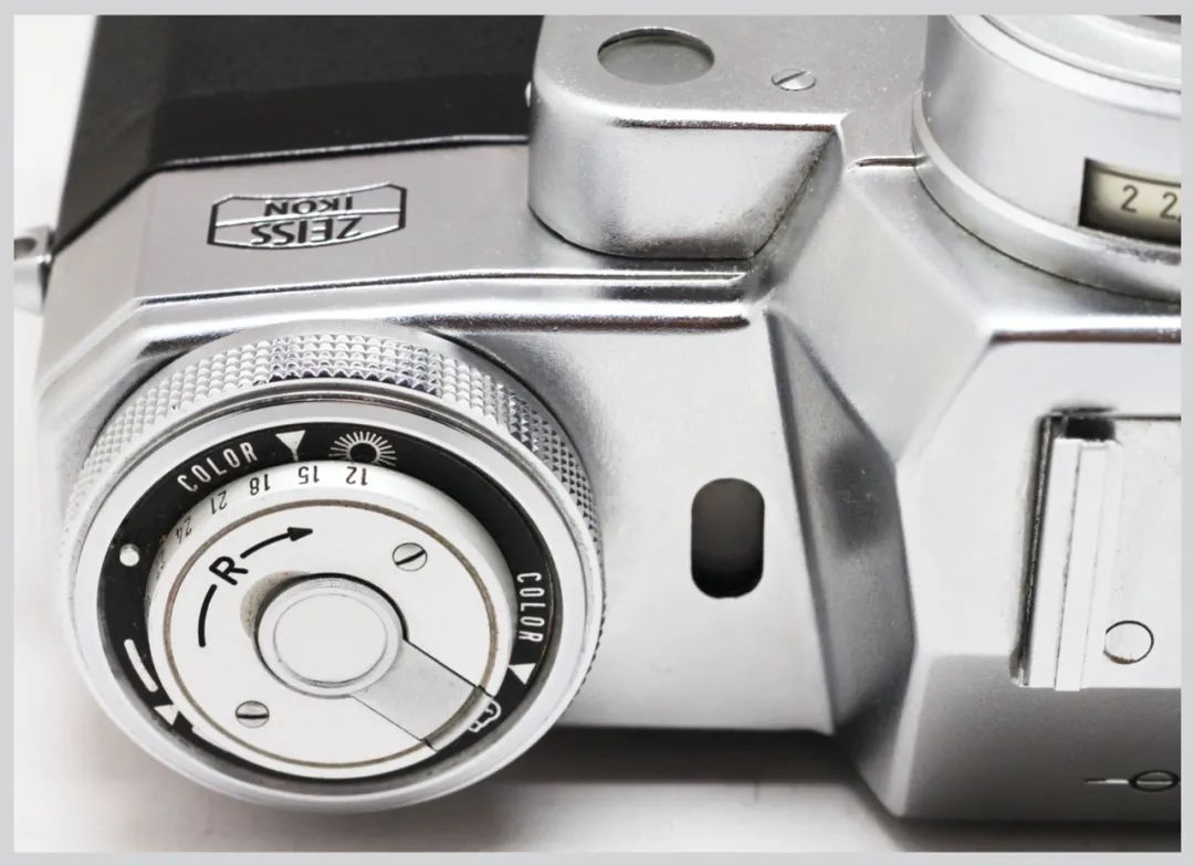 “独眼龙”的快门按钮、计数器转盘、快门数值转盘(兼曝光补偿)、感光度转盘都是联动的(见图03),胶卷感光度范围是德制 9~33 DIN 或者美制 ASA 5~1300,感光度的设定会直接限制快门范围。