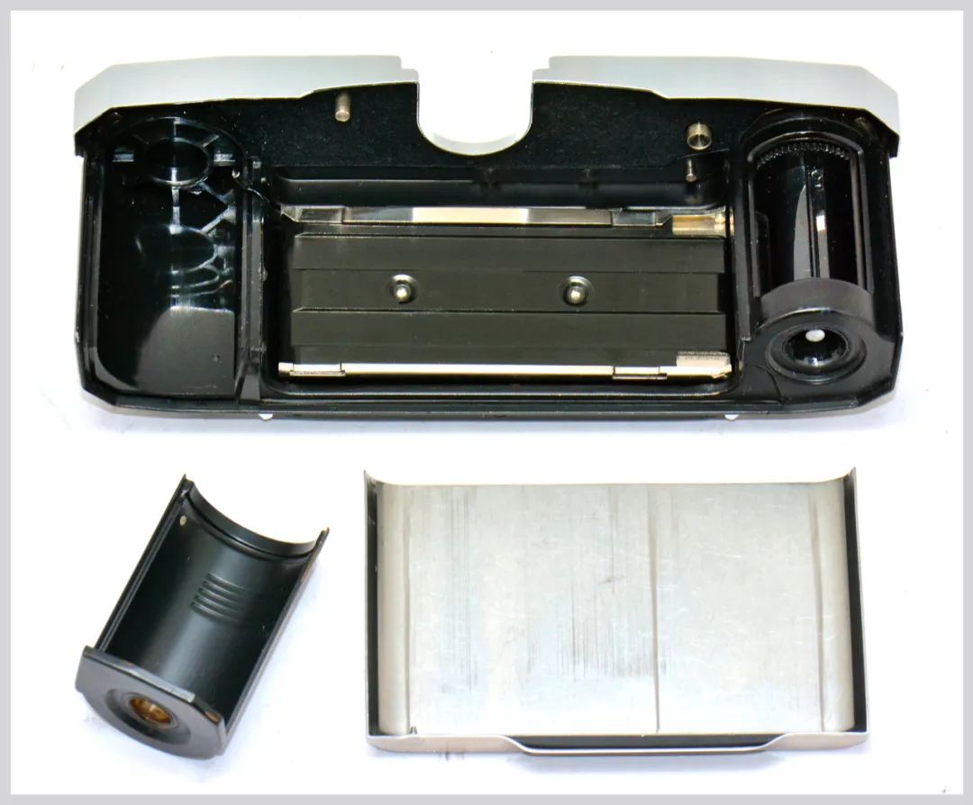 倒完胶卷后再旋开机底另一侧开后盖旋钮(图13)即可卸下后背取出胶卷。“独眼龙”的后盖与康泰时(Contax) 旁轴系列一样,都是整体拆卸的,内部十分简洁(图14),卷片轴可拆卸,操作不便又容易丢。
