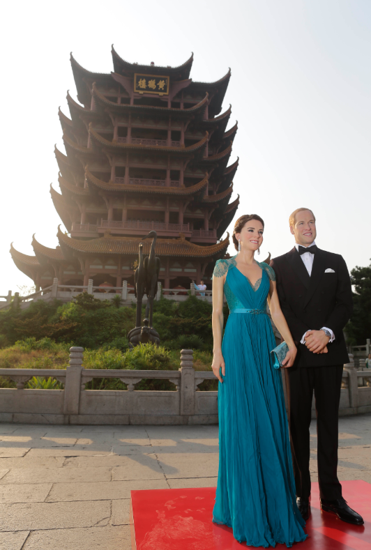2013年8月13日,武汉杜莎夫人蜡像馆的英国威廉王子夫妇蜡像亮相黄鹤楼前,供游人拍照合影,共庆“七夕”佳节。新华社发