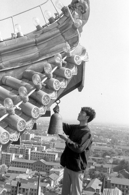 重建中的黄鹤楼。工人正在楼顶的每个飞檐上悬挂铜钟。新华社记者于澄建摄(1984年12月22日)