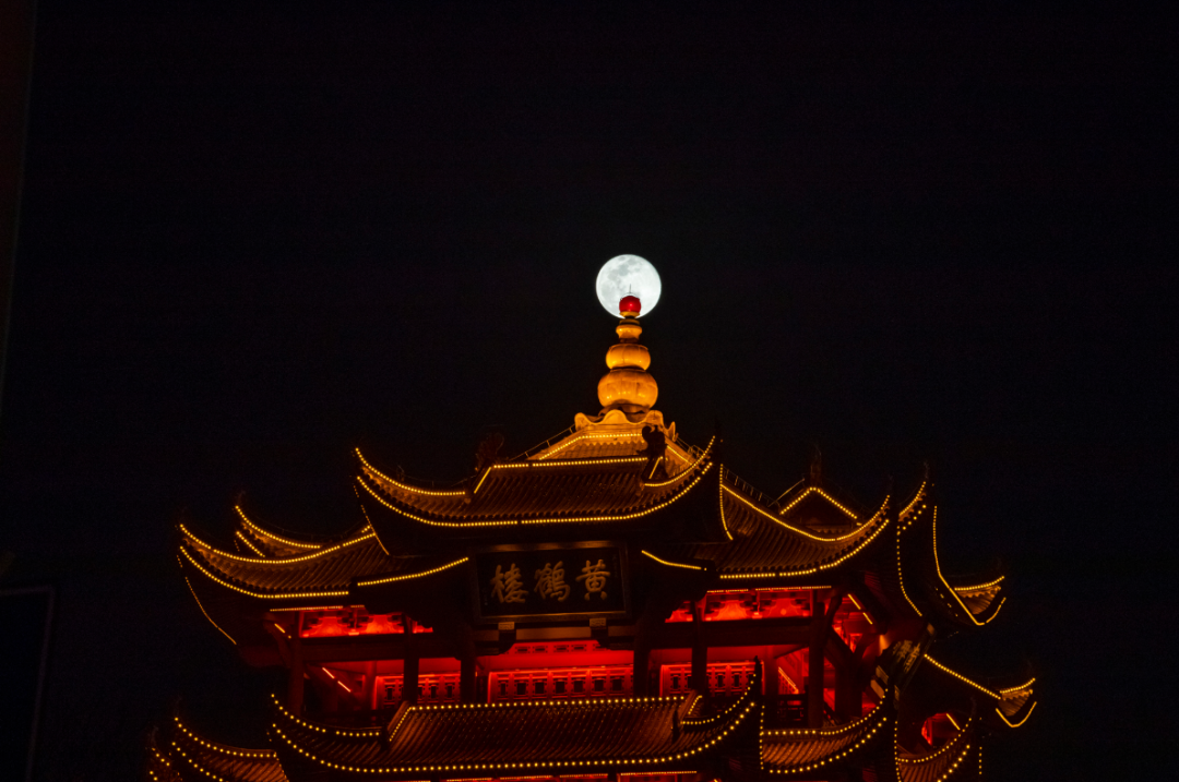 3月10日拍摄的与武汉黄鹤楼相映的明月。 新华社记者 沈伯韩 摄