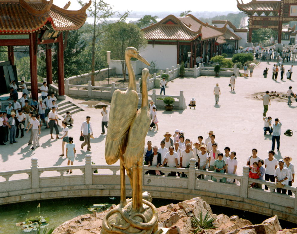 武汉重建的黄鹤楼前,栩栩如生的黄鹤铜塑吸引了游人。新华社记者花皑摄(1985年9月18日)