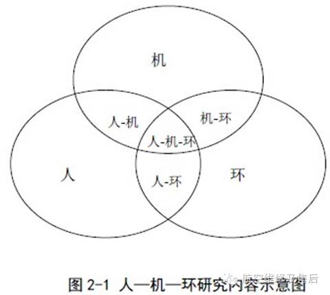 对人—机系统而言,在研究中应把人作为系统的主体,发挥人的主导作用,人的因素方面主要包括人体生理、心理、人体测量及生物力学、人的可靠性。在充分考虑人—机功能匹配、可靠性、维修性外,还要重视环境因素对人—机系统的影响。环境因素不仅对航空装备的设计、制造十分重要,而且对航空装备的使用和维修保障尤其具有实际意义。在维修过程中,维修人员的情绪、能动作用等受到客观环境的影响,在不同的客观环境中产生的波动和差异不同,而这种波动和差异又将直接关系到维修工作效率的高低和维修效果的好坏。因此,在航空维修过程中,不仅要研究如何运用客观事物,取得满意的维修效果,还要研究环境因素对维修效果的影响。从环境因素来说,可以通过研究维修工作场所的气候、照明、灰尘、有害气体等对维修效果的影响,从而创造一种适宜的工作环境,以减少疲劳、保证健康、提高效率。人—机—环研究内容如图2-1所示[3]。