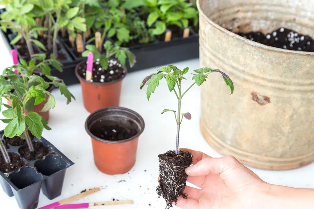 搭配土壤的方案一般是用到堆肥土+泥炭土+珍珠岩或河沙,以5:3:2的比例混合;或者用泥炭土+鸡蛋壳粉末或骨粉+堆肥或缓效型颗粒肥+河沙,以6:1:2:2的比例混合。在盆土里添加一些鸡蛋壳粉末(洗干净晒干后碾成粉末)或骨粉,可以增加土壤中的钙元素,可避免番茄幼苗倒伏或根茎腐烂。