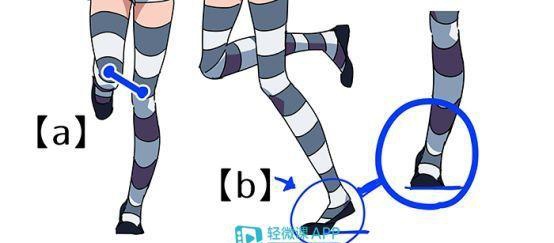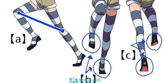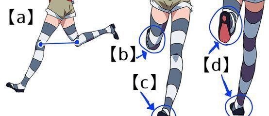 b、虽然有时候脚掌会完全落到地面上,但还是要大胆地提取脚后跟浮起的时机,加强跑步的印象。画正门的话要呢个好好地看到脚背。