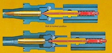 既然STG-45用的是滚柱延迟开锁结构,也就是说,这种结构属于是半自由枪机的一种,一般的步枪机枪,都是导气式+枪机偏移式闭锁或者是枪机旋转式闭锁,通过活塞或者导气管吹气,让枪机框后座一段距离,由枪机框带动枪机去开锁的,但是这种半自由枪机原理则不同,不需要导气原理,不需要导气装置,不需要开闭锁斜面,不需要闭锁凸笋等一系列组件。而是延迟开锁时机,枪机开锁抽壳的时候,弹头已经飞走了。这种结构,相对来说非常简单。