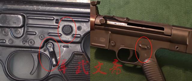STG-45在保险和快慢机上,比STG-44要优化的非常多的。其保险快慢机都是在同一个旋钮上,可以一起调节。而且,位置也恰恰是位于握把上方,三个档位,非常方便,触手可及的。而STG-44不同,其保险和快慢机是分开的,快慢机在保险上方,在枪左右推动切换全自动和半自动的,而保险在握把上方。这两把枪的握把,和机匣都是一体的。