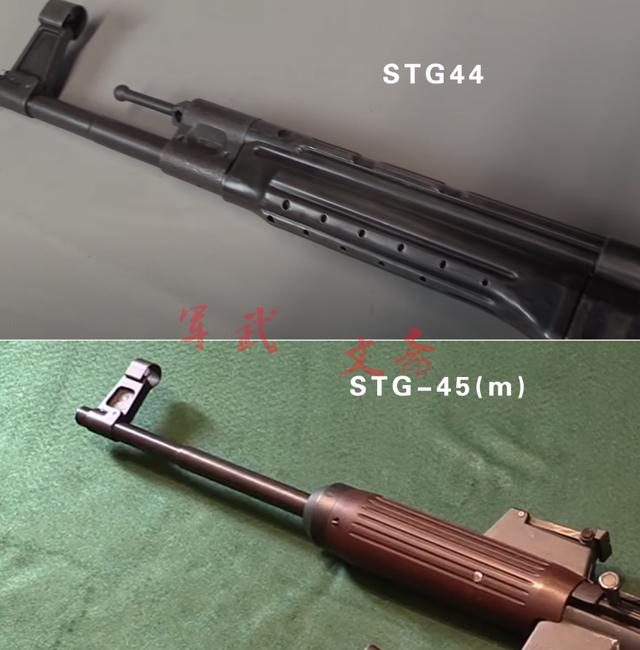 首先就是枪的前部,STG-44用的是长行程活塞原理,有导气管有活塞,这些都是和枪管平行的,而STG-45用的是滚柱延迟开锁,没有活塞,也没有导气管,没那些杂七杂八的,其枪管上下,护木那里,并没有STG-44那么复杂,看上去非常简单,这也是STG-45最典型的外形特征。