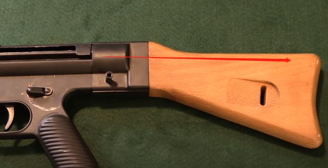 而STG-45也是参照了STG-44的枪托,其复进簧也是塞进了枪托内,这种方式在击发的时候,可以直接将后坐力传递至枪托,这样可以使后坐力非常柔和,也能在一定程度上,减少枪口上跳,这种设计在后来叫做恒定后座,某种意义上,也给了AR-15很多灵感。