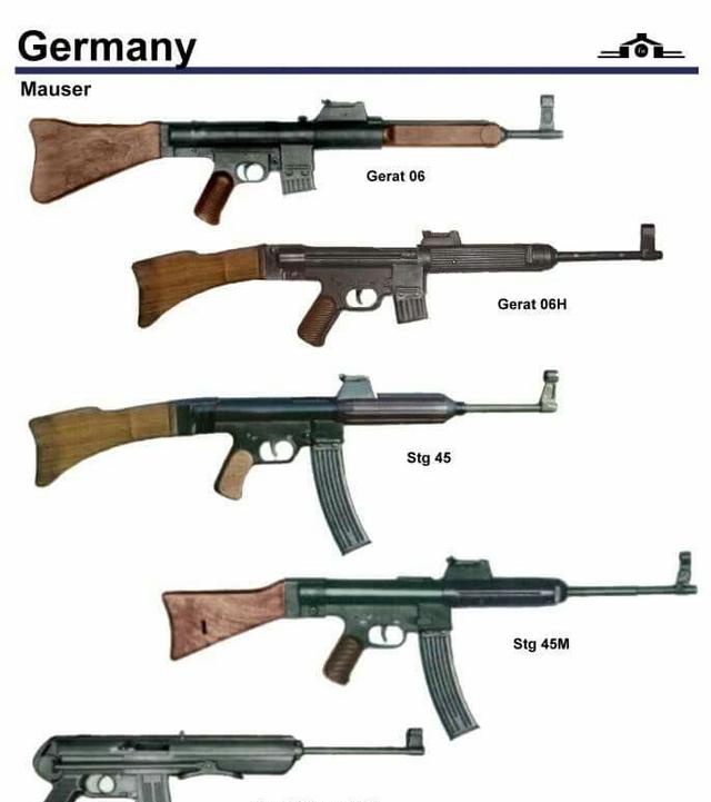 最后给大家介绍以下几个和STG-45亲缘颇深的枪支,下图从上到下分别是Gerät 06的第二个型号、STG-45(M)、STG-44、Gerät 06第一型号、Gerät 06第三型号。Gerät 06从第一型到STG-45(M)是在不断地改进,最终成型的是STG-44(M)。